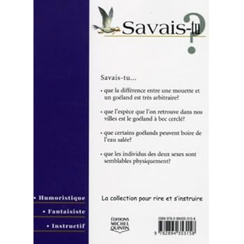 Pour tout savoir sur les goélands ! Des documentaires humoristiques sur les animaux servis à la manière BD. Un rendez-vous avec l'originalité, l'humour et l'art.Le mélange est explosif et le pari de faire rire les enfants qui ont l'habitude de crier et de pleurer à chaudes larmes à la vue de ces bestioles est réussi. Les adultes s'y laisseront prendre aussi.Savais-tu ? ... que la différence entre une mouette et un goéland est très arbitraire ? que l'espèce que l'on retrouve dans nos villes est le goéland à bec cerclé ? que certains goélands peuvent boire de l'eau salée ? que les individus des deux sexes sont semblables physiquement ?Savais-tu ? pour découvrir et assimiler avec humour et intelligence de nouvelles connaissances sur les habitudes de vie, les moeurs de ces animaux dont on ne parle jamais : caractéristiques, alimentation, reproduction, prédation, etc ... Pour une fois les stars sont ici les mal-aimés de la société animale !